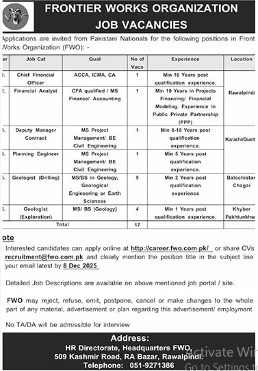 Candidates, if you are seeking Frontier Works Organisation Rawalpindi Jobs 2025, Apply Online yes. Then it would help if you tried to complete the Frontier Works Organisation Rawalpindi Jobs because here you can easily apply for these vacancies: Chief Financial Officer, Financial Analyst, Deputy Manager Contract, Planning Engineer, Geologist (Drilling), and Geologist (Exploration).
