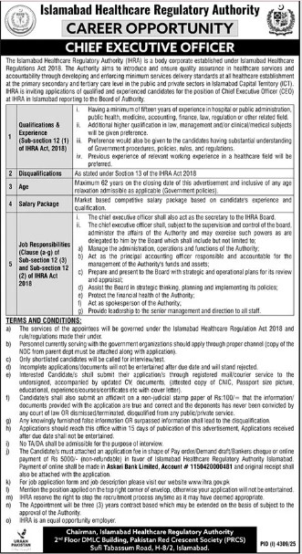 Candidates, if you are seeking Islamabad Healthcare Regulatory Authority Jobs 2025, apply now. Then it would help if you tried to complete these Islamabad Healthcare Regulatory Authority Jobs because here you can easily apply for this vacancy: Chief Executive Officer.