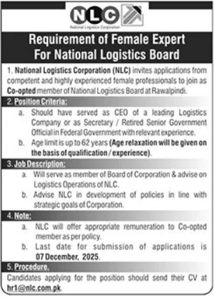 Both Male and Female candidates can apply for these Logistics Corporation Jobs who have the Qualification: Should have served as CEO of a leading Logistics Company or as Secretary / Retired Senior Government Official in the Federal Government with relevant experience. Age limit is up to 62 years (Age relaxation will be given based on qualification/experience)., Many more experienced candidates should apply before 07 December 2025.