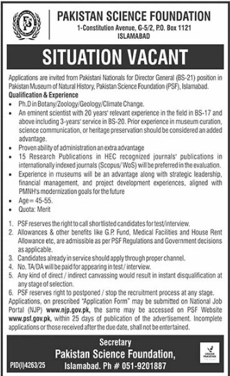 The last date to apply for this job is within 25 days.Pakistan Science Foundation Jobs 2025 Advertisement